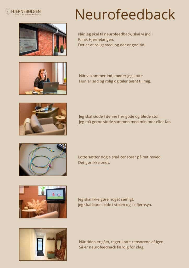 En social story er en enkel og visuelt støttet fortælling, der forbereder personen på, hvad der skal ske under et neurofeedback-forløb hos mig.